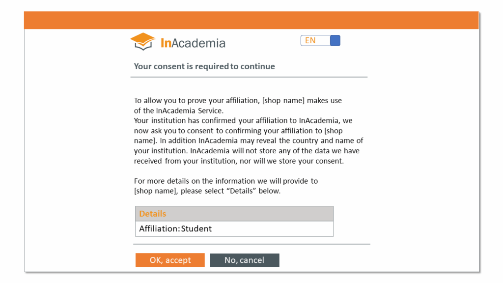 Merchants using InAcademia could request that a student validates its entitlement to access a service or offer during the checkout process. The validation can be initiated either by seamlessly integrating a call to the API within the merchant’s registration or payment process, or by using the InAcademia ‘I’m a Student’ button.