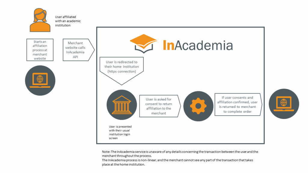 InAcademia is an affiliation validation service (”the Service”) offering for the end user (an individual affiliated with an academic institution as “student”, “staff”, “faculty”, “employee” or “member”), a mechanism to prove to a merchant website (e.g. web shop) that they are entitled to the services, discounts or special offers on the basis of a positive verification of their affiliation with an academic institution.