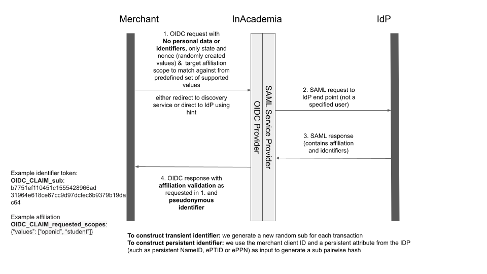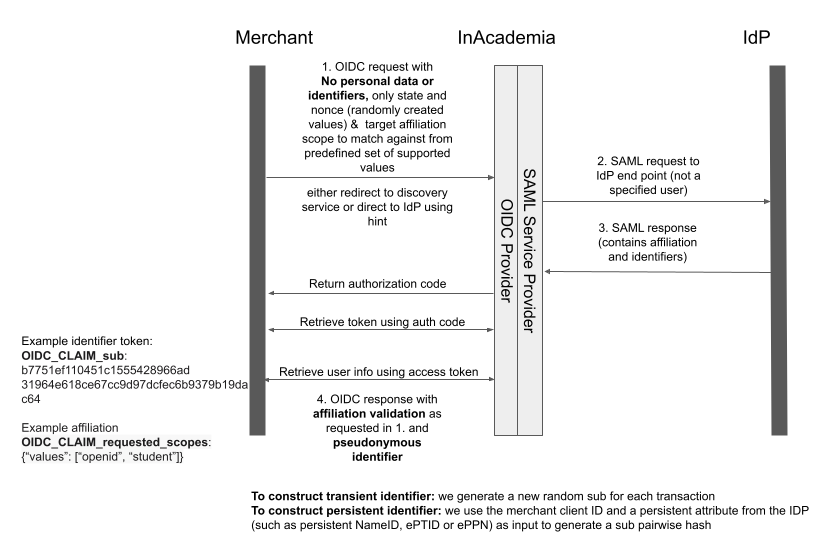 The SAML response from the institution’s IdP is processed by the InAcademia Service to create an OIDC response to the merchant. The OIDC response provides the value of the affiliation attribute to the merchant. Where the merchant requests a transient identifier, InAcademia creates a pseudonymised transient identifier. Where the merchant requests a persistent identifier, InAcademia creates a pseudonymised persistent identifier and does not release the values received from the institution’s identity provider that are used to create the pseudonymised persistent. The pseudonymised identifiers cannot be translated by the merchant.