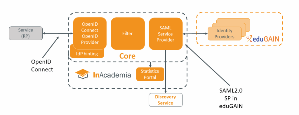 Authentication and attribute consumption is handled by the SAML Service Provider component of InAcademia, which is a SAML2 SP and a member of eduGAIN.